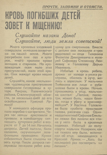 The leaflet "The blood of the dead children calls for revenge! Listen to the Cossacks of the Don! Listen, people of the Soviet land! Many bloody atrocities were committed by the German invaders on our land...". 1942 MZSB. KP 271/5."data-title="Листовка "Кровь погибших детей зовёт к мщению! Слушайте казаки Дона! Слушайте, люди земли Советской! Много кровавых злодеяний совершили немецкие захватчики на нашей земле…". 1942 г. МЗСБ. КП 271/5. The leaflet "The blood of the dead children calls for revenge! Listen to the Cossacks of the Don! Listen, people of the Soviet land! Many bloody atrocities were committed by the German invaders on our land...". 1942 MZSB. KP 271/5.">