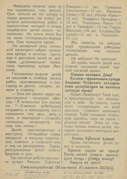 The leaflet "The blood of the dead children calls for revenge! Listen to the Cossacks of the Don! Listen, people of the Soviet land! Many bloody atrocities were committed by the German invaders on our land...". 1942 MZSB. KP 271/5."data-title="Листовка "Кровь погибших детей зовёт к мщению! Слушайте казаки Дона! Слушайте, люди земли Советской! Много кровавых злодеяний совершили немецкие захватчики на нашей земле…". 1942 г. МЗСБ. КП 271/5. The leaflet "The blood of the dead children calls for revenge! Listen to the Cossacks of the Don! Listen, people of the Soviet land! Many bloody atrocities were committed by the German invaders on our land...". 1942 MZSB. KP 271/5."> - МЗСБ. КП 271/5.