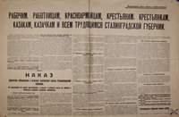 Обращение Сталинградского губернского комитета ВКП(б) «Рабочим, работницам, красноармейцам, крестьянам, крестьянкам, казакам, казачкам и всем трудящимся Сталинградской губернии», приуроченное к выборам в сельские (хуторские) Советы Сталинградской обл.