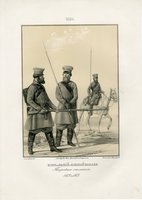 Егерь и пеший и конный казаки Тверского ополчения, 1812 и 1813 гг. Лист 2531. Фернлунд 2-й по рисунку П.К. Губарева. 1840-1860-е гг. Россия. Литературная Редакция Российской Военной хроники (В. Дарленг). Из издания А.В. Висковатова «Историческое описание одежды и вооружения Российской армии». Бумага, литография.
